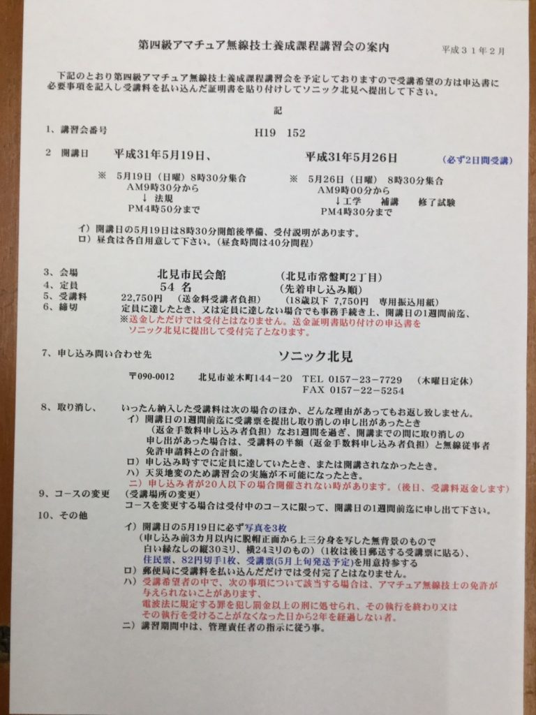 年号が令和に替わって、北見で初めての第4級アマチュア無線講習会です。5月19日と26日(いずれも日曜日)の二日間講習です。申し込みはソニック北見さんへ。締め切りは5月12日のようですが、必ずお店に確認をお願いします。